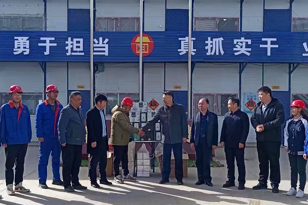 在会议室,唐志强听取了项目基本情况汇报,详细了解职工生产生活、劳动防护等方面情况。随后深入施工现场,查看职工工作环境并与职工交流,倾听一线职工声音。C型料场正在进行挡墙主体施工,他叮嘱现场管理人员高度注意安全,防止高空坠落。来到项目办公区,院内墙壁上“诚信守责、勇于担当、真抓实干、业绩服人”的工作总要求显得格外醒目,“大家远离家乡,在一线兢兢业业,工作辛苦了,我代表公司工会来看望你们……”他向每位职工送上保温杯、牛奶等慰问品,“内蒙古风沙大,最近天气冷,大家一定要注意保暖……”他和职工一一握手问好,并送上殷切关怀。